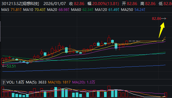 1月7日复牌当天,观想科技直接拉出“一”字涨停板,报收82.86元/股,单日涨幅达20%。