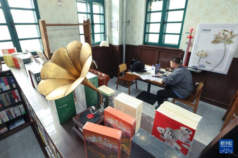 市民在北书房·新华历史书店内处理工作文件(4月21日摄)。